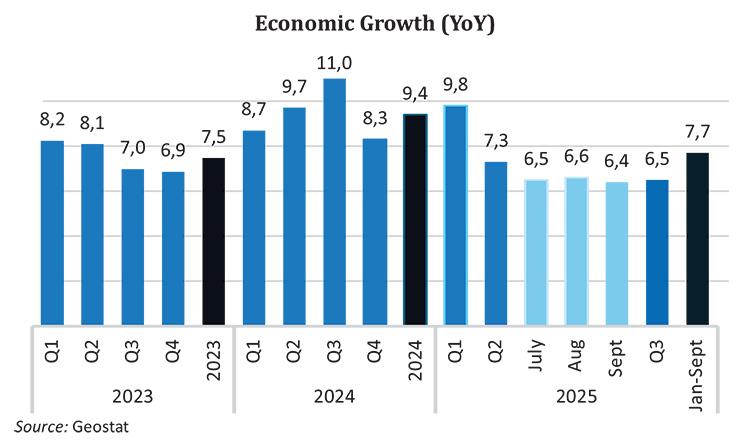 According to the EBRD’s updated September forecast, Georgia’s economic growth for 2025 will be 7%—one percentage point higher than the bank’s May forecast—and 5% for 2026. It states that economic expansion is supported by increased lending and significant growth in the information technology and education sectors. It estimates that Georgia will have the highest average economic growth among European countries in both 2025 and the 2025-2027, with figures double those of other EU candidates. After 9.4% growth in 2024, the economy expanded by 8.3% in the first half of 2025. Tourism resilience continues to support fiscal and external balances, while reserves have increased to $5.2 billion, covering over three months of imports.