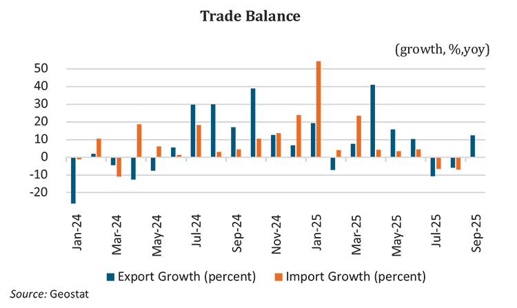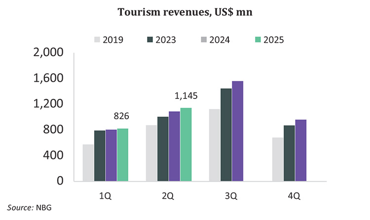 The ADB updated its forecast in September, projecting 7% growth in 2025—one percentage point higher than in April—and 5% growth in 2026. The bank estimates that Georgia’s real growth in the first half of 2025 was 8.3%; the services sector increased by 12.9%, mainly driven by a 28.6% growth in the ICT sector. Vehicle re-exports, a key source of foreign exchange, grew by 30.3%. However, a 25% U.S. tariff on imported vehicles introduced in April 2025 may raise prices for second-hand U.S. vehicles, potentially reducing Georgia’s re-exports. But growth in services—particularly in tourism, transport, and information technology—is expected to offset any future slowdown in merchandise exports. Tourism revenues grew at 3.8%, building on record-high receipts in 2024, while overall service exports expanded by 10.2%, reflecting Georgia’s emerging role as a key transit route for Trans-Caspian trade and cargo movements. Higher U.S. and European transfers helped increase remittances by 3.5% in H1—despite a 26.5% drop in transfers from Russia. Foreign direct investment (FDI) declined by 7.7%, mainly due to weaker investment outside information and communication, though the share of reinvested FDI remained high at 83.6%.
