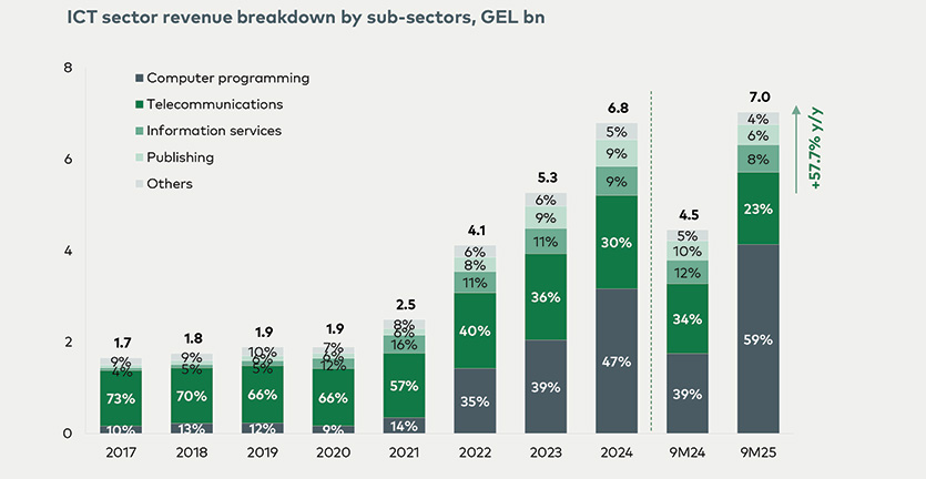 Georgia’s ICT community is, in fact, larger than indicated by the numbers above, especially in IT. The registered ICT industry is dominated by computer programming and IT services, which by late 2025 account for about 59% of total sector revenue. This is also the fastest-growing segment and is largely export-oriented, with the United States and Europe as its main markets. Telecommunications, once the largest part of the industry, now make up roughly 23% of ICT revenue. Key developments in 2025 include record levels of mobile service spending and the continued rollout of 5G and gigabit LTE networks. Information services contribute around 8% of total revenue and remain an important area for diversification, while software publishing—including both software and book publishing—maintains a stable share of about 6% of overall ICT turnover.